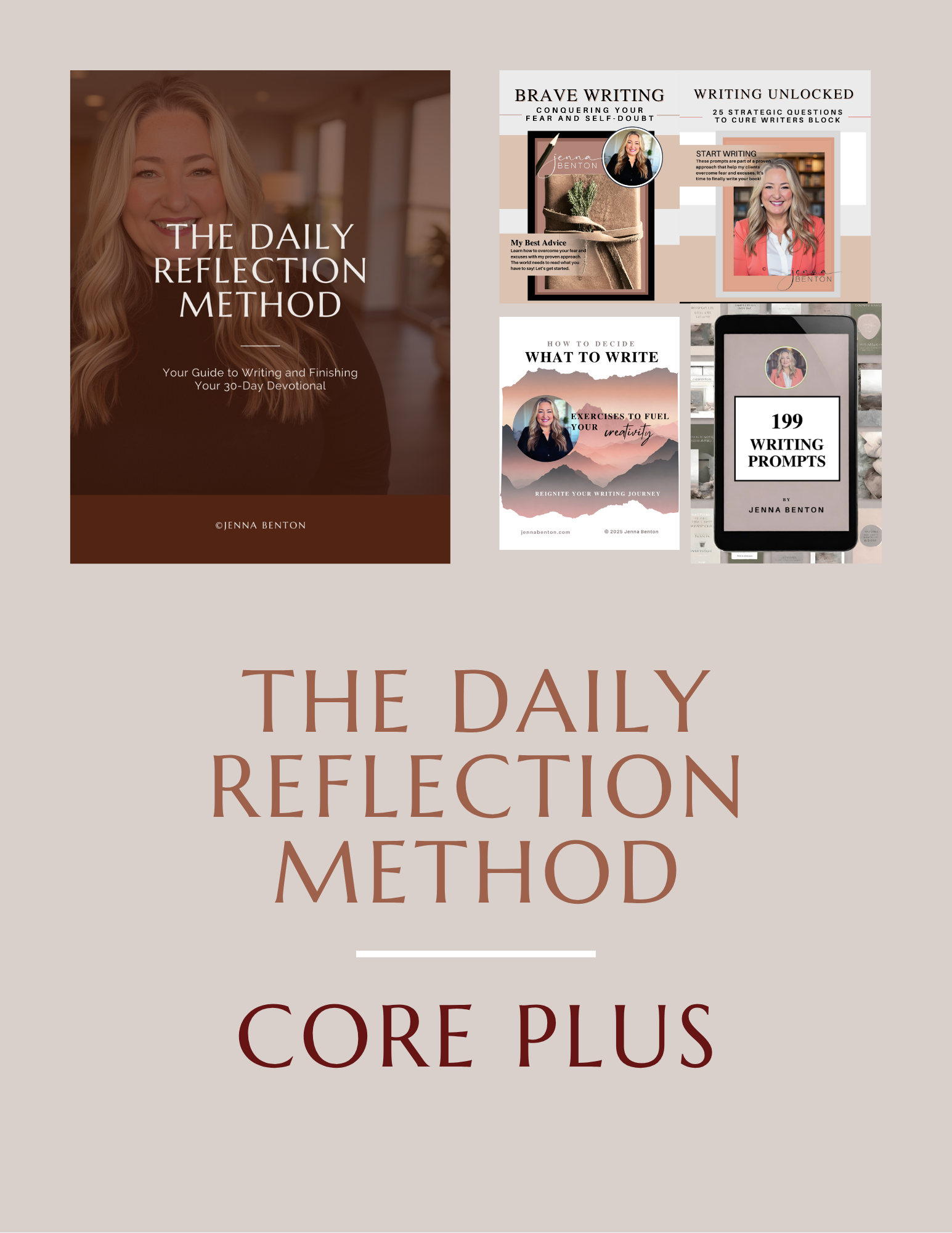 The Reflection Method Mini-Training: Core Plus builds on the Core Mini-Training with extra guidance and resources to help you go further, faster. You’ll get the full Core Mini-Training, plus a narrated Orientation Video, Quickstart Guide, and four companion eBooks—Brave Writing, Writing Unlocked, How to Decide What to Write, and 199 Writing Prompts—each with its own audio bonus.